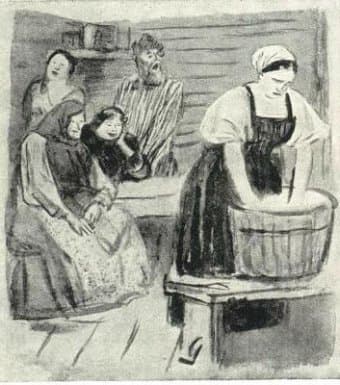 - Безымянная баба. Она ссорится с подругой, которая отправляет ее домой. Тошно женщине просто от этой мысли. Что ее так тревожит? Дома у нее хуже, чем на каторге: старший зять бьет так, что сломал ребро, средний украл полтинник, спрятанный в клубок. Страшнее всех обещания младшего зятя. Он пугает ножом и смертью.
